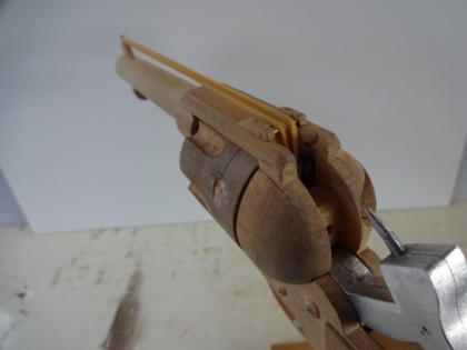 実機のサイズが分からないのでネット検索の写真からサイズを割り出した。大体あっていると思う。 左の画像はハンマー(撃鉄)を起こした状態。ニードル(撃針)は飾りではなく実際に弾丸を叩いて輪ゴムを発射する。 |