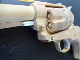 | 2019,02,27 Colt Single Action Army 略して 「コルトSAA」 又は 「ピースメーカー」 とも呼ばれているアメリカ製の銃。 おなじみアメリカ西部開拓時代に使用されていた弾倉回転式拳銃である。 寸法、形状、動作も出来るだけ本物らしく見えるゴム銃を制作した。 下の画像は輪ゴムを装填した状態。装填数は設計がまずく2〜3発しか装填できない。全長278mm。輪ゴムサイズ#18。 |