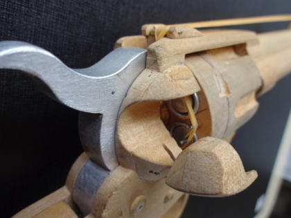 | 右の画像は本機の可動部分である。弾倉回転機構はハンマーを起こすと装填した輪ゴムの張力で60度回転する。 | ![]() |