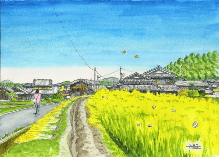 過去の風景スケッチです。 2021年4月7日写生 F4 ◆大津市下田上森町 菜の花畑