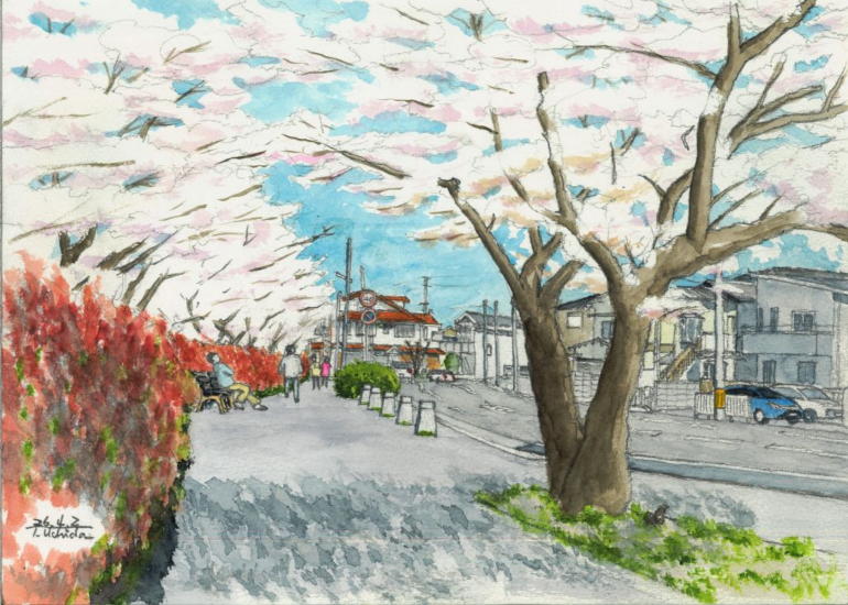さざなみSC例会。JRガード付近から長沢川の椋井橋の方をを向いて満開の桜をスケッチした。左の赤い新芽の植物はレッドロビンと言うらしい。